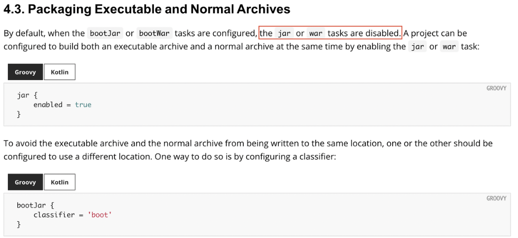 Spring boot 2.5 이전에는 war or jar tasks are disabled이라고 명시 되어있음.